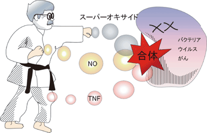 第一には活性酸素じゃ。マクロファージや好中球の産生する活性酸素はスーパーオキサイド、ハイドロキシラジカル、過酸化水素などいろいろある。活性酸素は悪者にされておるが、これがなかったら感染症で簡単に病気になっておる。